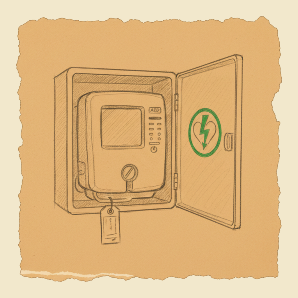 Field sketch — AED safety and maintenance — keeping the box ready for the day.