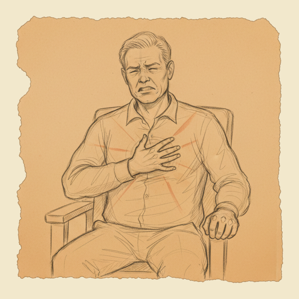 - Anxiety / panic attack — chest tightness, breathlessness, sweating, feeling of impending doom. Often indistinguishable from a heart attack without medical investigation.