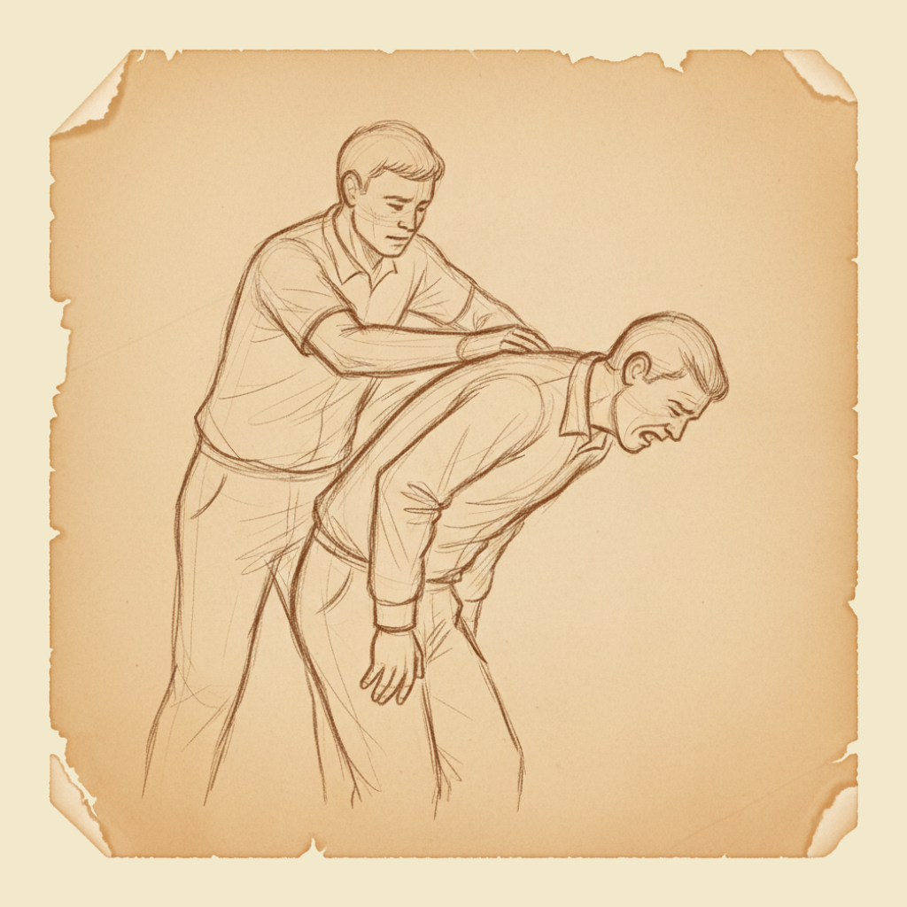 Field sketch: Choking — back blows, chest thrusts, no Heimlich