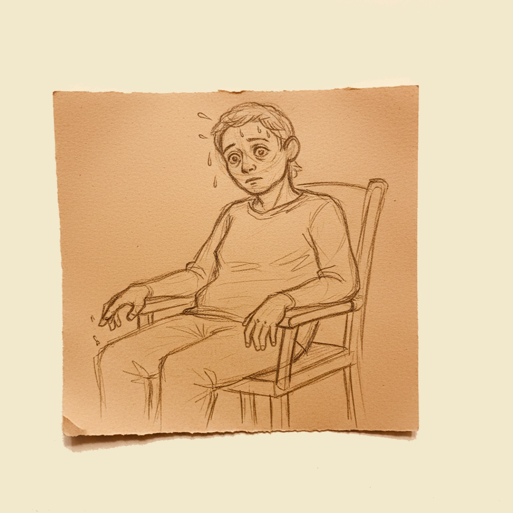 1. Pale, sweaty, shaky. A cold sweat on the forehead, the hands trembling.