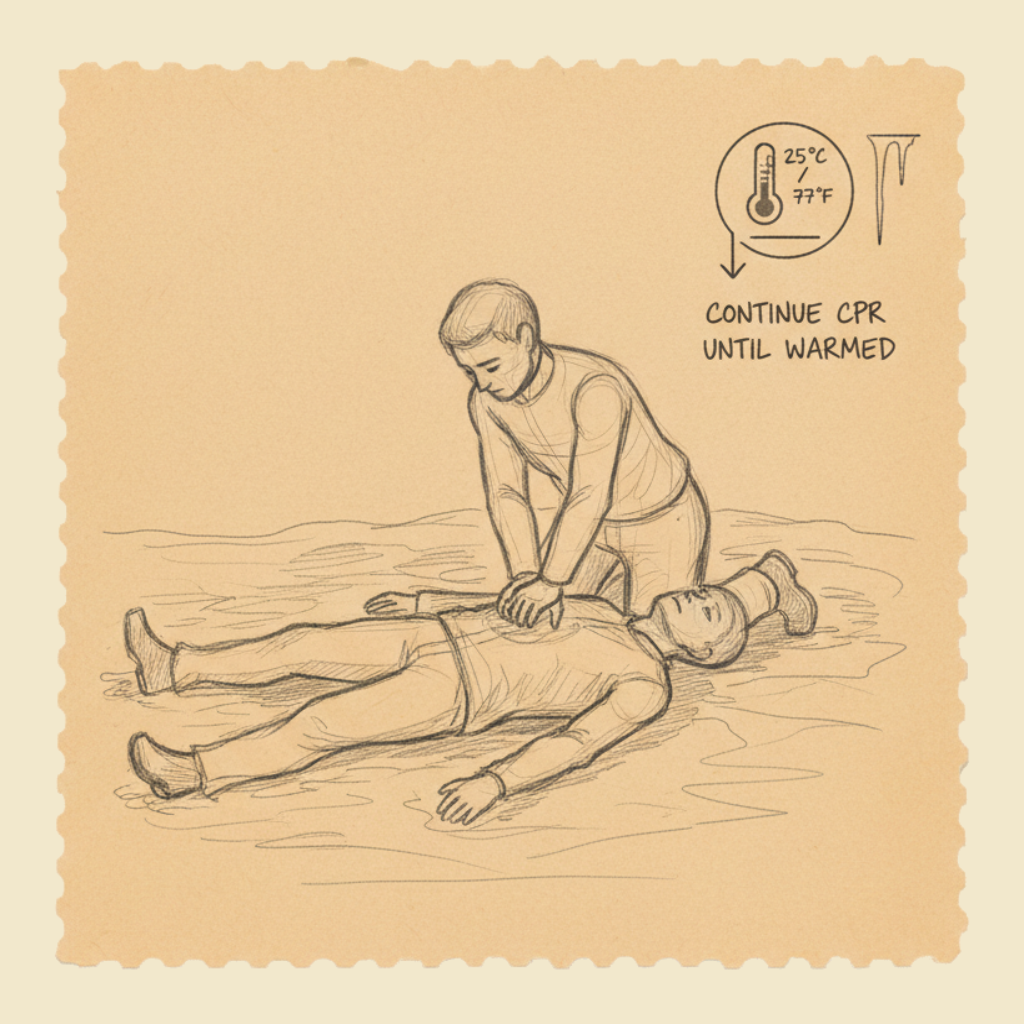 Casualties pulled from cold water are usually both drowning and hypothermia cases. Treat the drowning first (5 initial breaths, then standard CPR — see the drowning chapter) and the hypothermia second. Do not stop CPR because the casualty is "too cold to save" — the cold may be the very thing protecting their brain.