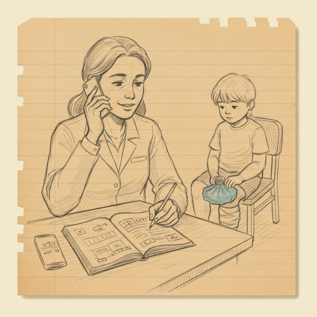 - Forward-looking — what the educator suggests the parent watch for, when to seek further medical attention, when to expect a follow-up.