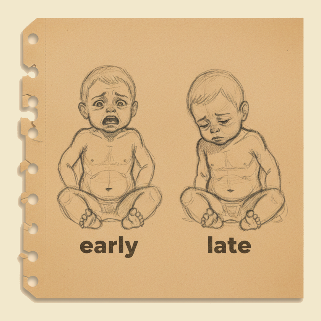- Quietness, withdrawal, drowsiness — later and worse. A child who was crying and now has stopped, or who was anxious and now seems calm, has not necessarily improved — they may be deteriorating. A drowsy child in respiratory distress is in serious trouble.