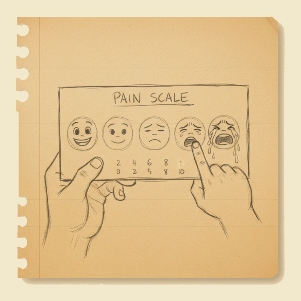 - They can use a pain scale — number scale, faces scale, colour scale. Most paediatric services use the Wong-Baker FACES scale (a row of cartoon faces from happy to crying) for children who cannot use numbers reliably.